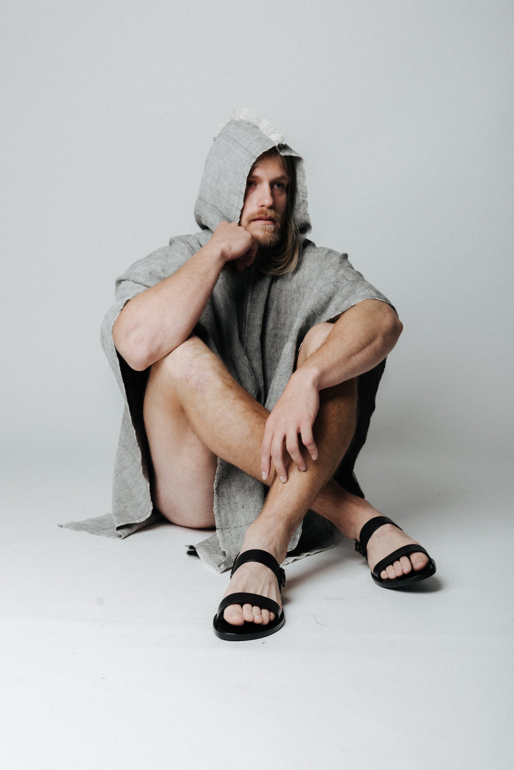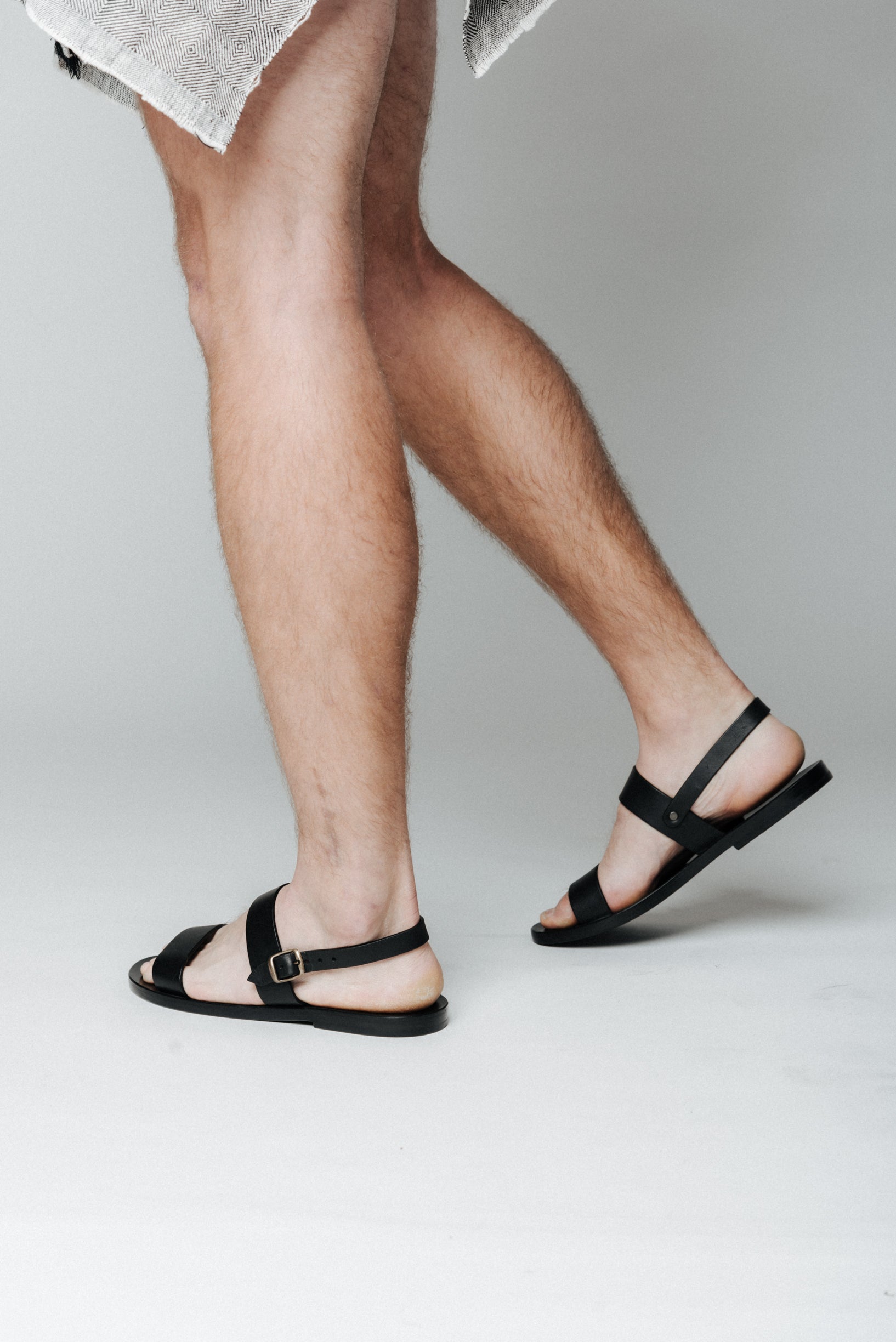 Sandalias emblemáticas de la casa OLIFE en cuero negro. Con amarre en el talón.
